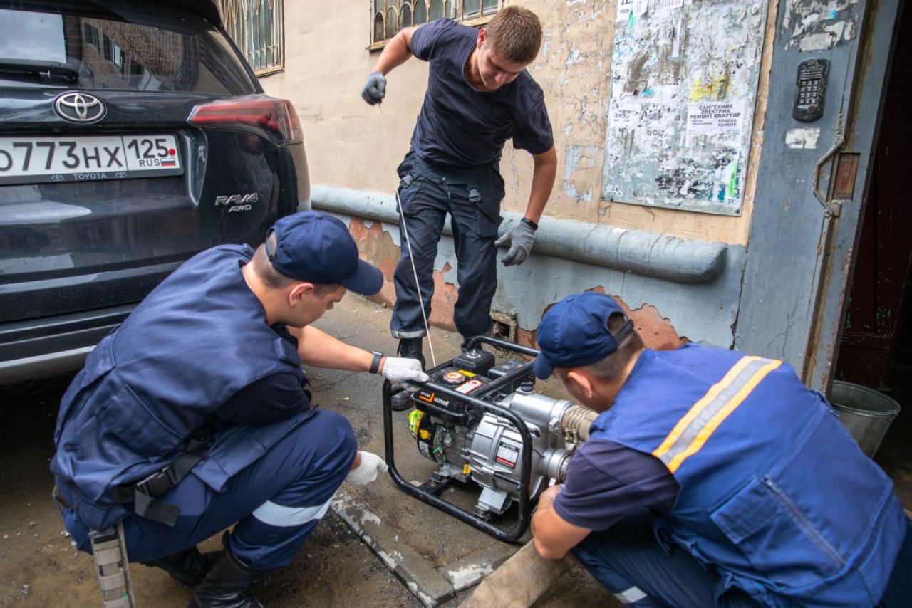 «Проводим осушение подъездов и квартир. Работаем там, где после августовских дождей воды было особенно много. Например, на Нефтеветке, 4а на первом этаже воды была примерно по колено. После дождей уже неделю находимся здесь. Сначала откачивали воду – теперь работаем с тепловыми пушками», – поделился информацией Глеб Черепахин, старший смены Владивостокской городской поисково-спасательной службы.