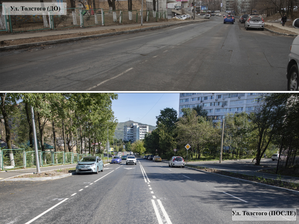 На улице Толстого в результате ремонта был обустроен новый проезд, приведены в порядок тротуары и сети инженерных коммуникаций, обустроено водоотведение, оборудованы остановки с сопутствующей инфраструктурой.