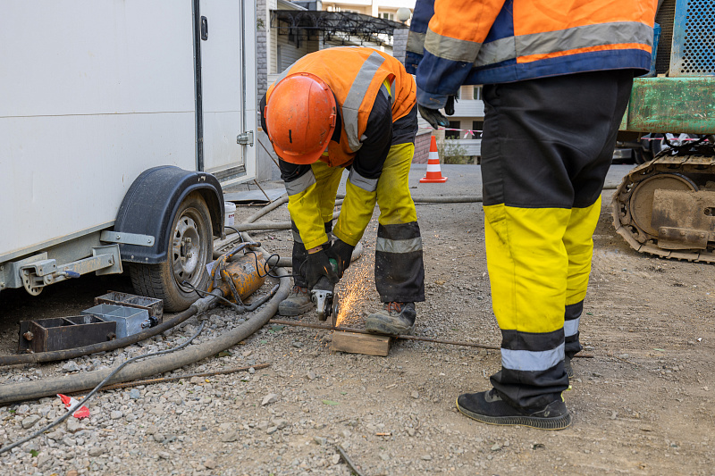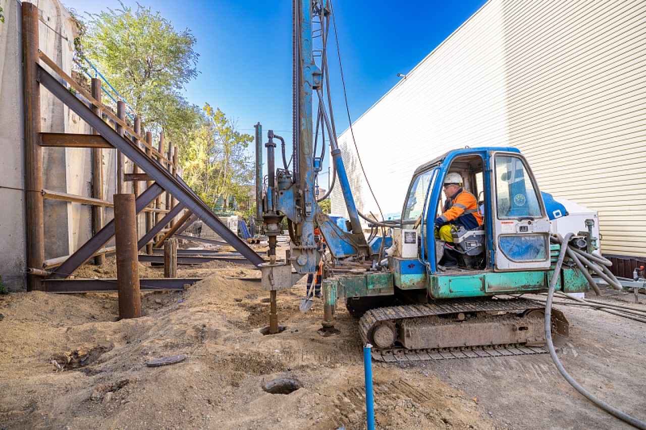 Работы на объекте выполняет подрядная организация ООО «Техник». Бригада занята бурением скважин и заливкой их бетоном. Это требуется для того, чтобы установить армированный каркас. Затем рабочие обустроят опалубку для нижней плиты подпорной стены.