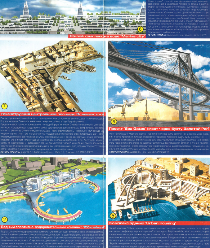 Углубленные для приема самых современных и больших круизных лайнеров причалы планировались на Русском острове - целых два причала в бухтах Аякс и Парис. Кампус ДВФУ команда Дарькина рисовала неподалеку от острова Елены на месте поселка Канал - в итоге авторы схемы немного промахнулись. Также авторы обещали новый судостроительный завод на Чуркине, Медцентр на Змеинке, конференц-центр в бухте Новик.