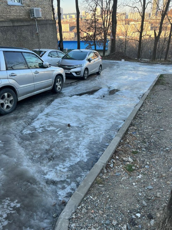 Во дворе на улице Адмирала Кузнецова во Владивостоке прорвало канализацию, а ночью грянули заморозки, поэтому из-за образовавшегося гололёда автомобили сегодня утром не могли выехать с придомовой территории. Сейчас жильцы пытаются найти причину обледенения и ответственных за проблему, сообщает ИА DEITA.RU.