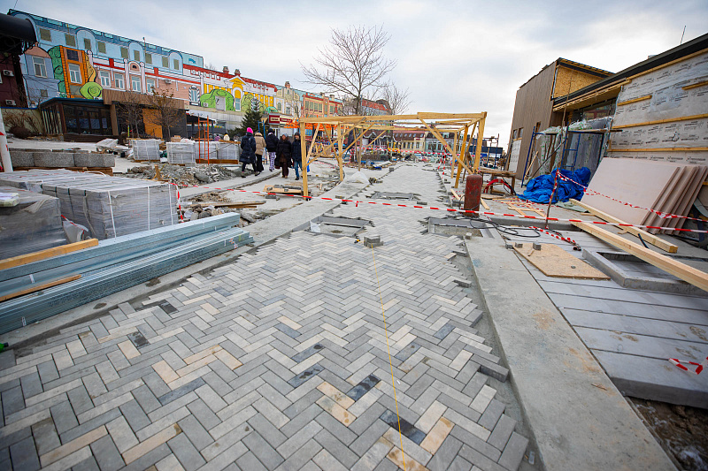 Работы идут в рамках графика. Сейчас завершается укладка тротуарной плитки на пешеходных зонах общественного пространства, параллельно с этой работой идёт возведение сцены для культурно-массовых мероприятий и павильона туристско-информационного центра. Рабочие производят монтаж дизайнерских лавочек, занимаются установкой других малых архитектурных форм. По планам завершить весь запланированный объём работы должны уже к концу года. Благоустройство проводится в рамках проекта «Туристский код Владивостока».
