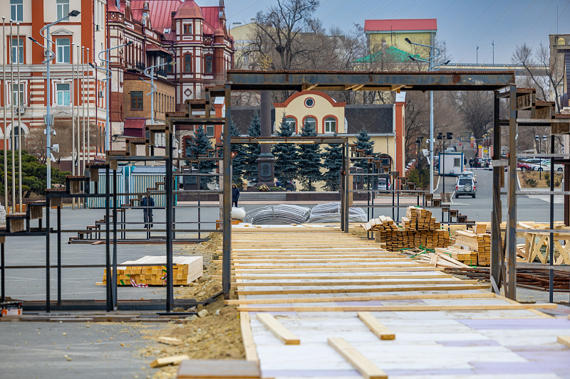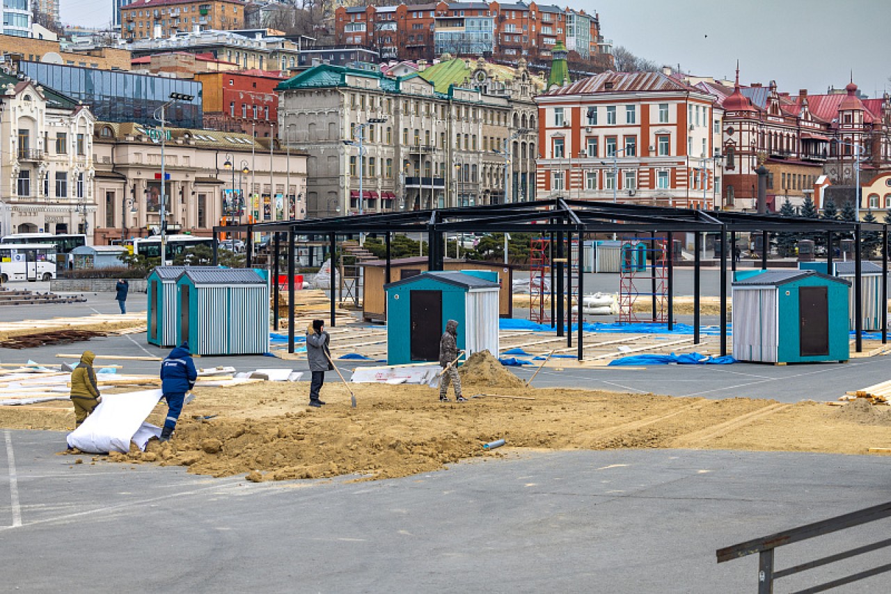 Возведением новогоднего городка на центральной площади Владивостока занимается Туристско-информационный центр Приморского края. Сейчас на месте будущего центрального городского праздничного объекта готовят основание для будущего катка – рабочие формируют подушку из песка, укладывают утеплитель для айс-матов. Далее каток будут заливать в несколько слоёв. Также на площади возводят центральный тёплый павильон, производится монтаж мостов.