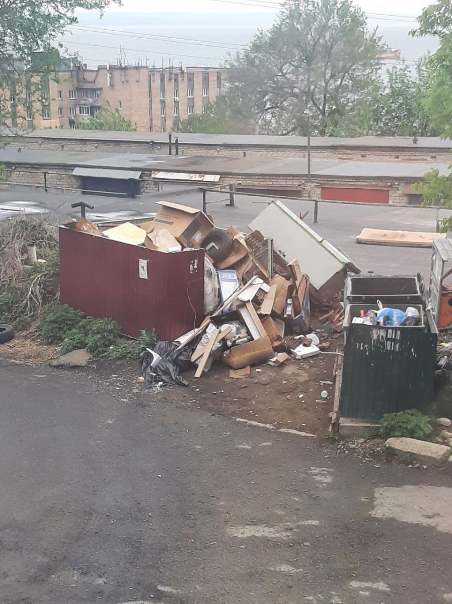 Например, по состоянию на сегодняшний день так выглядит контейнерная площадка под ТБО у дома № 33 по улице Добровольского, откуда с 1 мая мусор не выносили ни разу, по словам местных жителей: