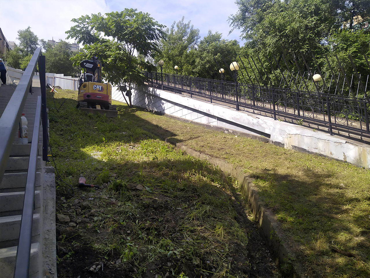 Вместо полуразрушенной едва живой лестницы на объекте уже появилась добротная широкая и прочная бетонная лестница. Однако её обустройство – лишь часть большой и сложной работы, которая предшествовала установке лестницы. По словам Евгения Устименко, генерального директора компании ООО «Владстройзаказчик», которая и выполняет работы, после демонтажа лестницы рабочим предстало своеобразное зрелище. Под лестницей находился полузаброшенный старый прогнивший коллектор, забитый грязью.