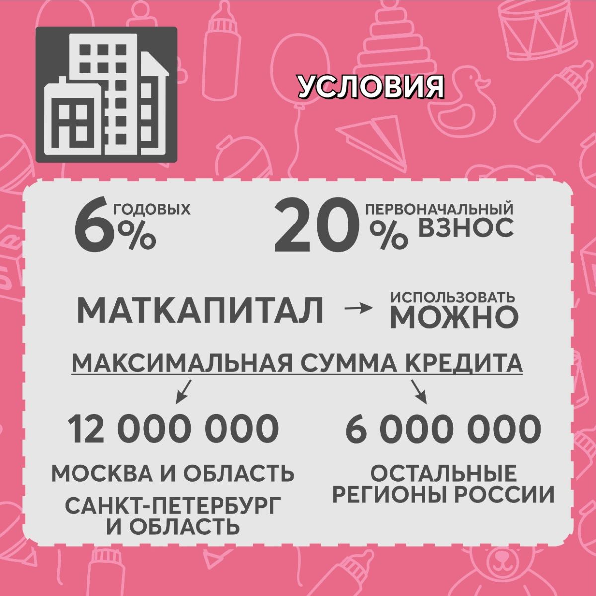 При этом неважно, в каких отношениях состоят родители: ипотеку могут оформить как те, кто не женаты, так и одинокий родитель. Условия таковы, что кредит дадут под шесть процентов годовых, сразу нужно внести сумму, которая составит 20 процентов от цены жилья, можно использовать маткапитал. Максимально можно получить до 12 миллионов для Москвы и области, а также Петербурга и области, а в остальных регионах – до шести миллионов. Можно и больше, но часть, превышающая оговоренные суммы, будет считаться отдельно по рыночным условиям.