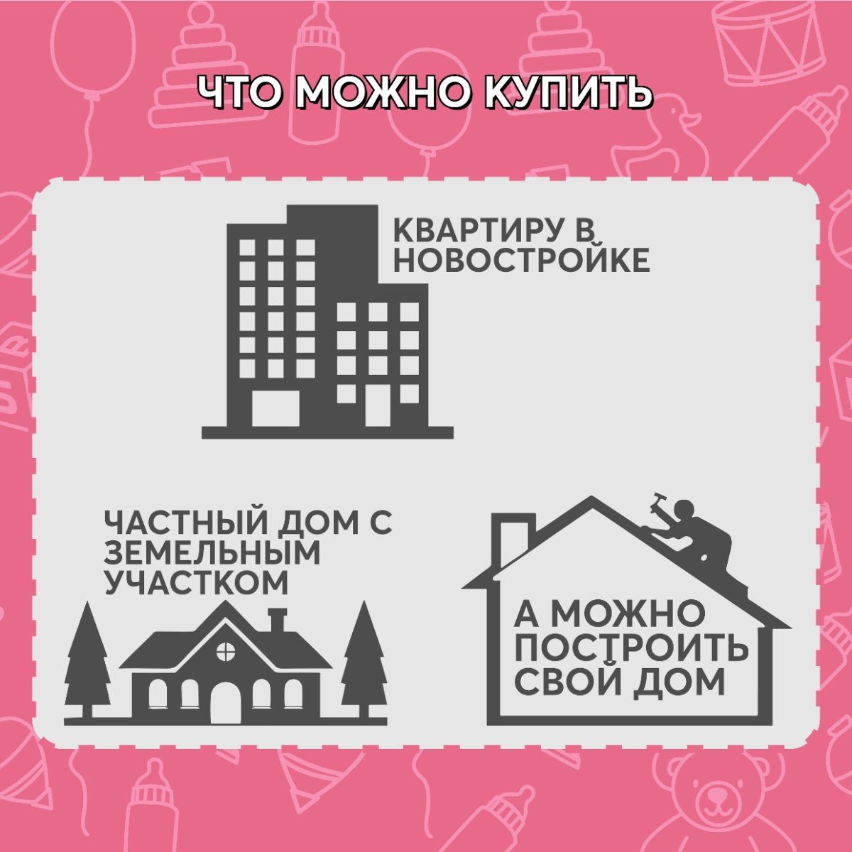 Купить можно жилье от застройщика в новостройке, готовый частный дом с землей от застройщика, а также взять деньги под строительство дома. Если в семье ребенок с инвалидностью, условия распространятся и на вторичный рынок, но только если в регионе на момент заключения договора не строят новые многоэтажки.