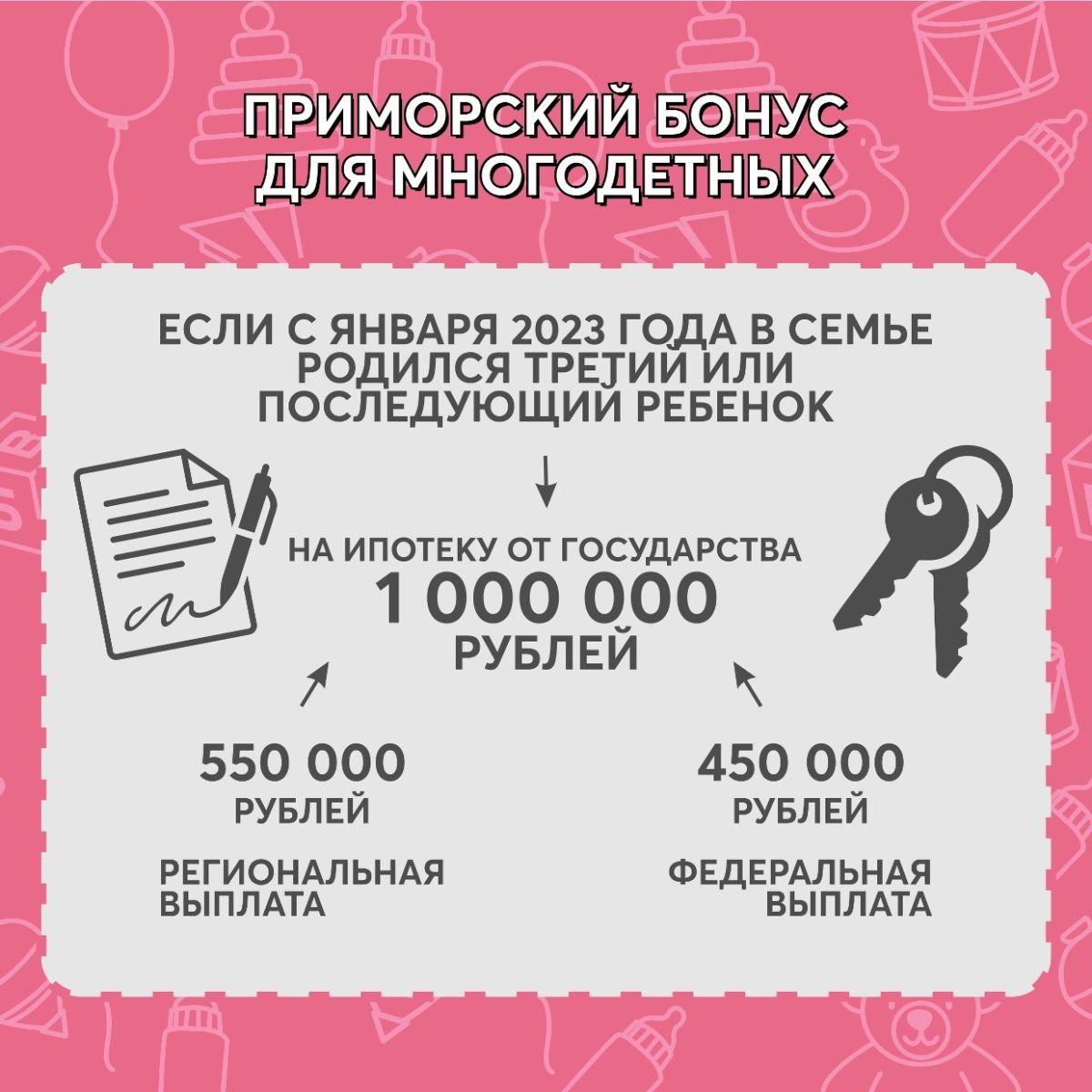 Это выплата федеральная, а в Приморье кроме федеральной выплаты для многодетных есть еще и региональная, в размере 550 тысяч, вместе сумма выплаты составляет миллион рублей. В пилотном режиме программу запустили только в прошлом году, и за тот год возможностью получить дополнительные средства на погашение ипотеки воспользовались больше тысячи семей Приморского края.
