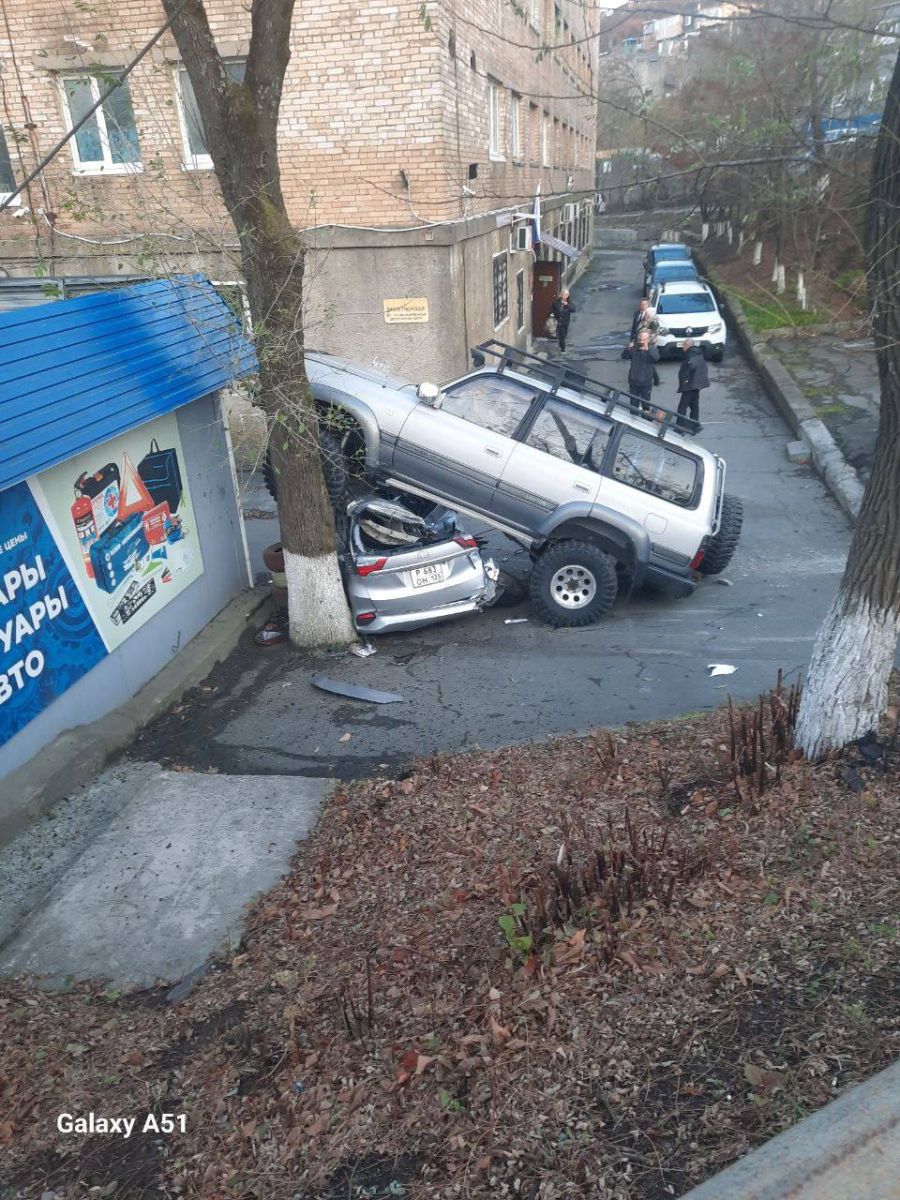 Конфликтная ситуация возникла минувшей ночью возле дома № 40 по улице Адмирала Юмашева. Гражданка за рулём внедорожника Toyota Land Cruiser, не справившись с управлением, слетела на машине с косогора и врезалась в припаркованный ниже автомобиль Honda Shuttle. Никто не пострадал.