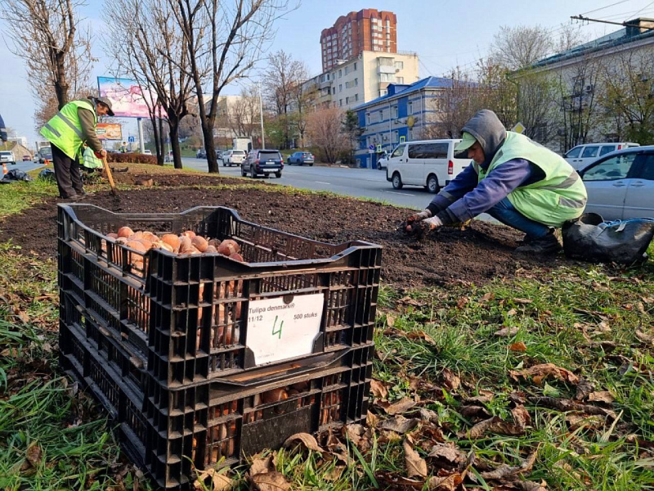 Работы по высадке луковиц тюльпанов проводятся на разделительной полосе проспекта 100-летия Владивостока, на улице Ивановской в районе остановки «Гайдамак», на цветнике в районе улицы Калинина, в сквере имени Рихарда Зорге, на Светланской, 67, а также по ряду других адресов.