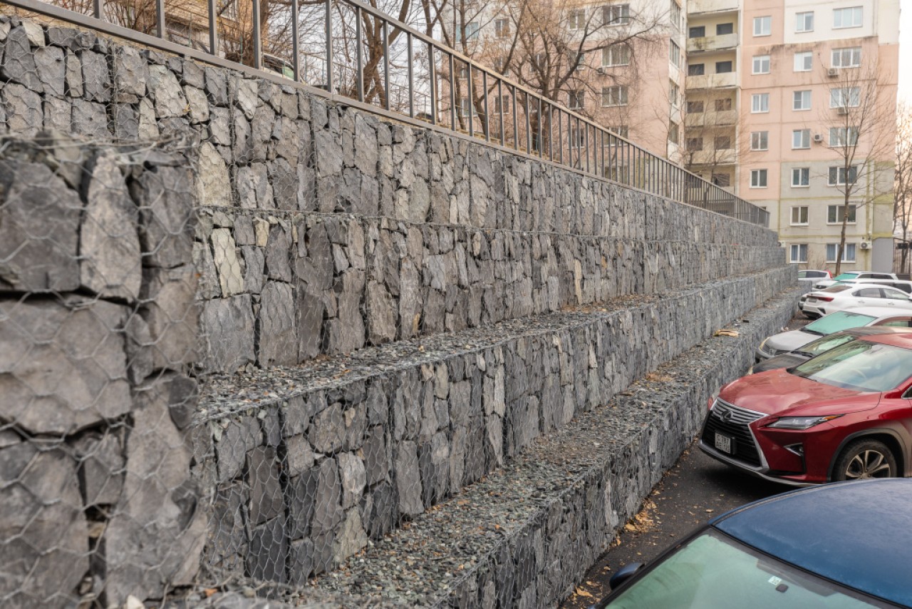 Размеры подпорной конструкции внушительные – 56 метров длина и 4 метра высота. Стена возведена из габионов. По словам специалистов управления городской среды администрации Владивостока, бригаде пришлось немало потрудиться на объекте. Ремонт конструкции включал целый спектр работ.