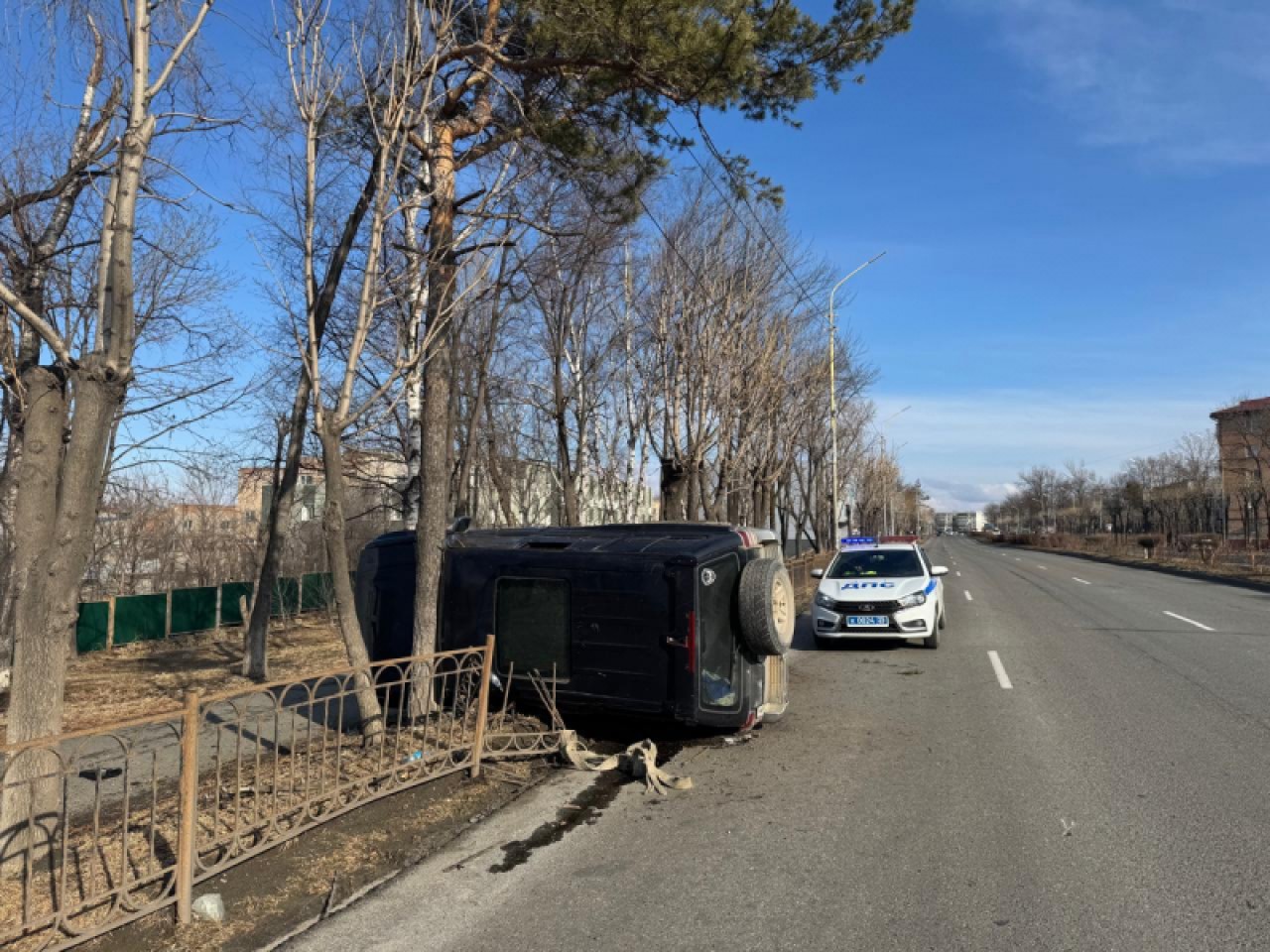 ДТП произошло на улице Фрунзе. Автомобилист, управлявший внедорожником «Мицубиси Паджеро», ехал в сторону Владивостока, не справился с управлением и выехал за пределы дороги. Автомобиль пробил ограждение и опрокинулся на бок.
