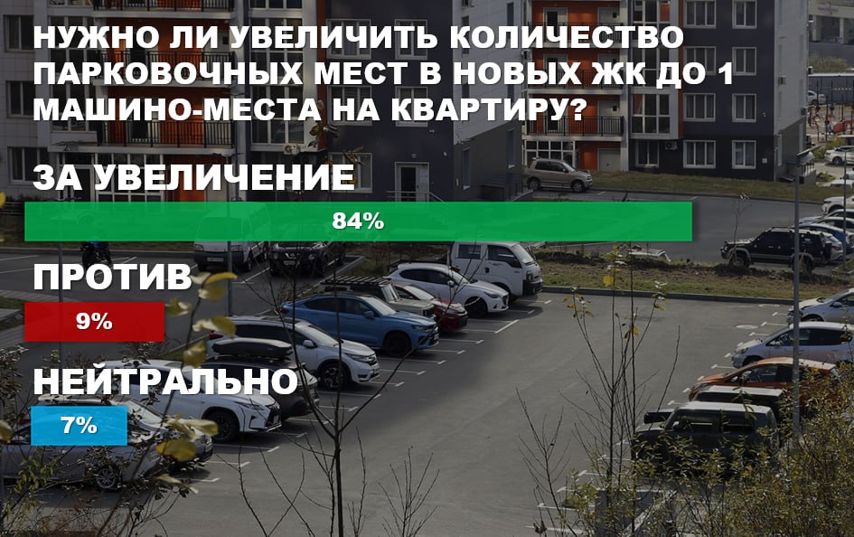 Из них 68% респондентов констатировали, что «все дворы запаркованы и увеличение количества машино-мест значительно повысит качество и комфорт жизни в новых домах », а еще 16% указали, что «парковочных мест в новых ЖК не хватает на всех жильцов». Только 9% высказались против, опасаясь «космической цены» за машино-место. Еще 7% заняли нейтральную позицию.