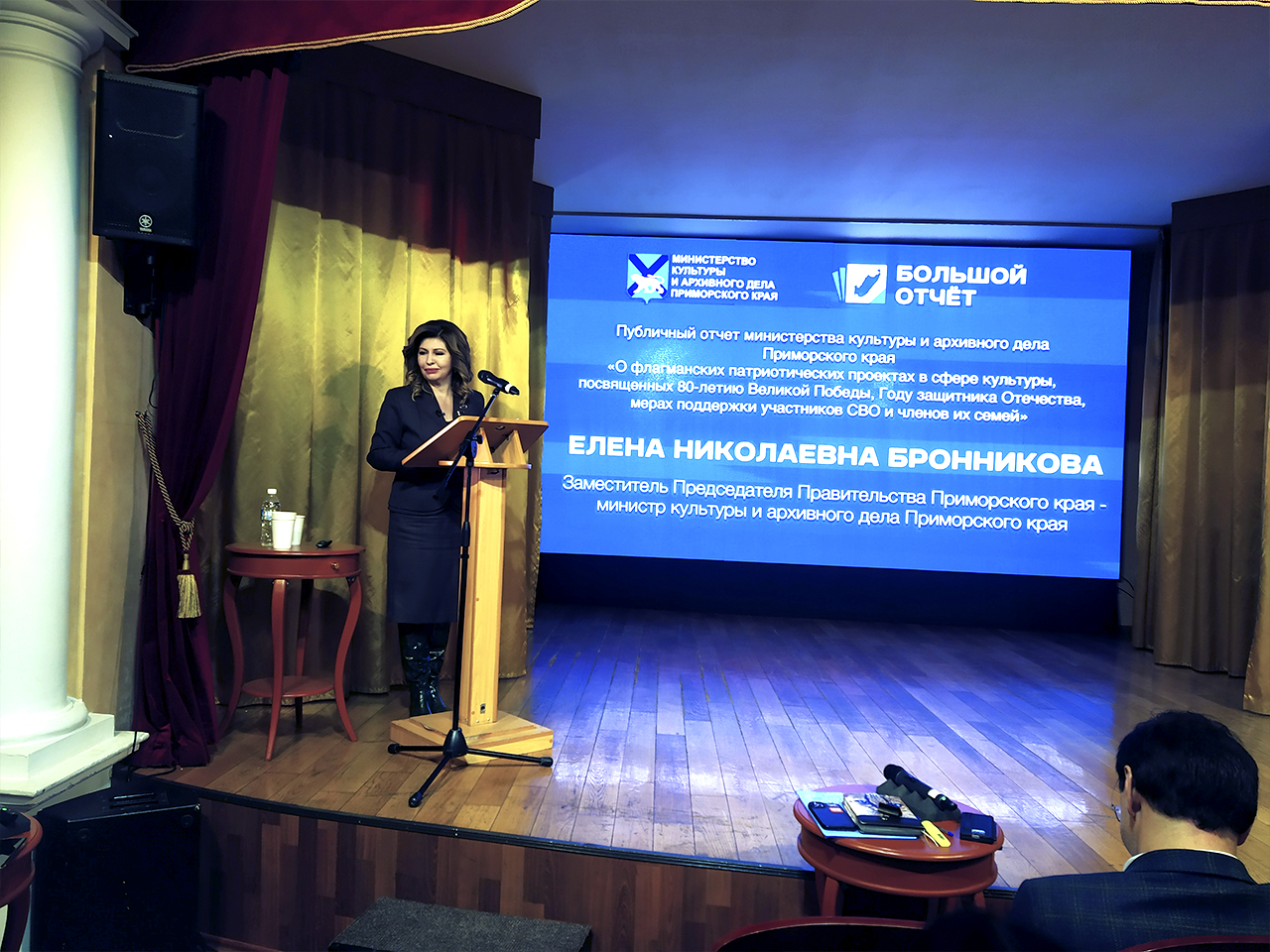 С публичным отчётом министерства культуры и архивного дела Приморского края «О флагманских патриотических проектах в сфере культуры, посвященных 80-летию Великой Победы, Году защитника Отечества, мерах поддержки участников СВО и членов их семей» выступила Елена Бронникова, заместитель председателя правительства Приморского края – министр культуры и архивного дела региона, рассказав, какая работа проводилась в 2025 году.
