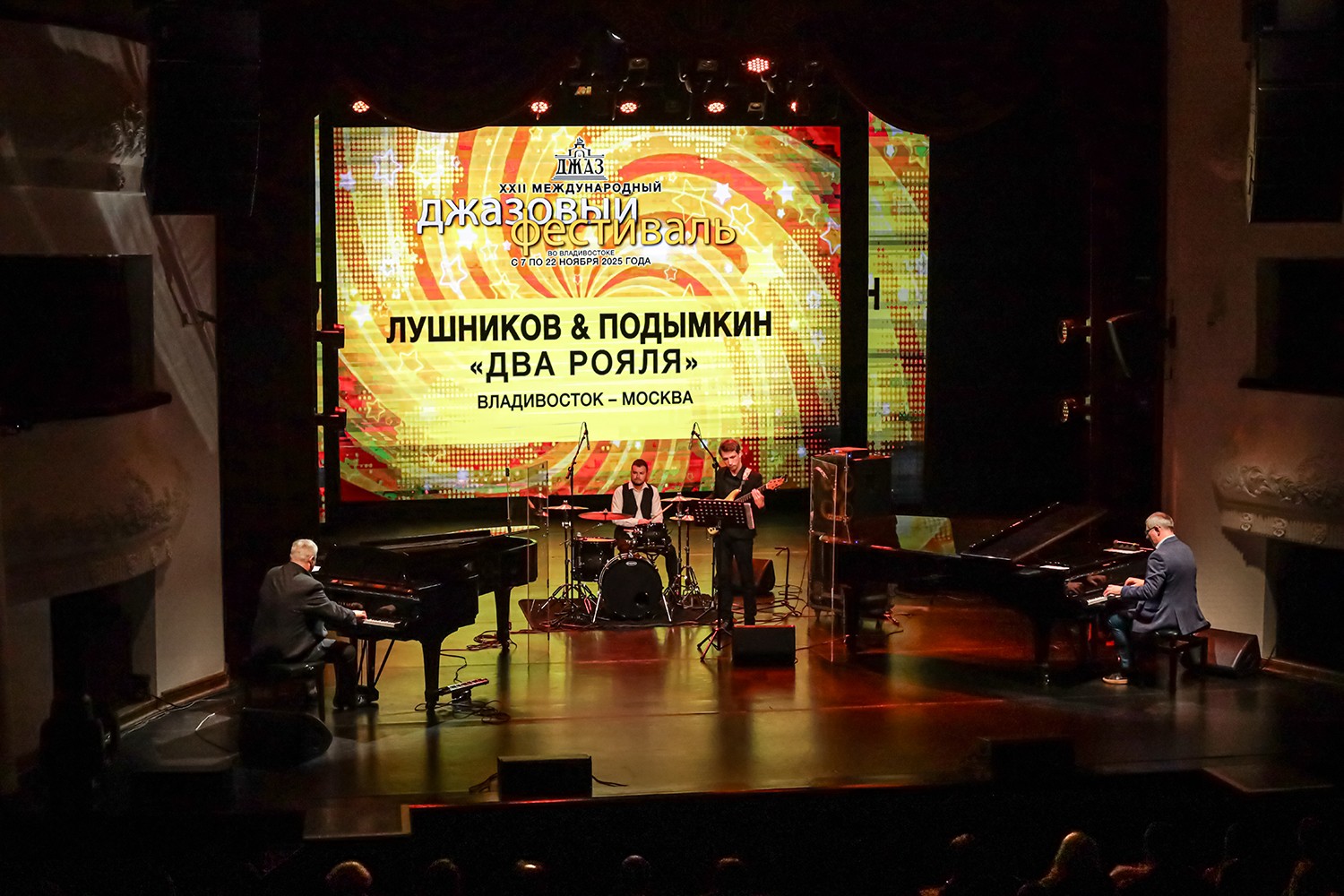 XXII Международный джазовый фестиваль проходит во Владивостоке. 14 ноября на сцене Приморской филармонии два джазовых пианиста Алексей Подымкин (Москва) и Илья Лушников (Владивосток) выступили с программой “Два рояля”. Это выступление особо стоит отметить как редкое и нестандартное для джазового формата. Услышать джазовые пьесы исполненные дуэтом на роялях удаётся немногим, просто потому, что дуэты такие редкость.