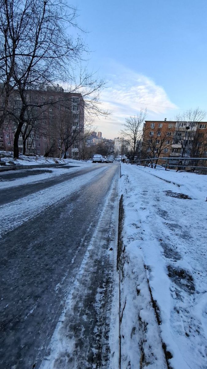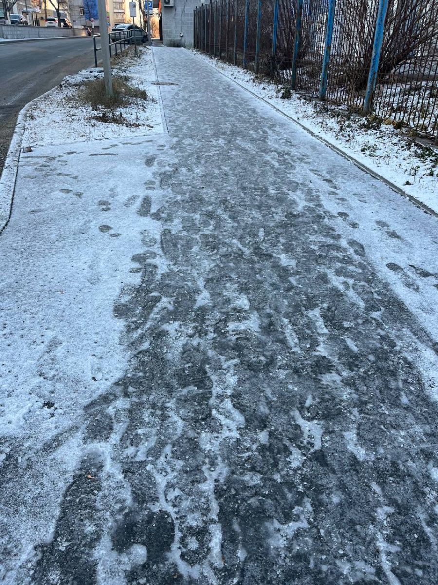 С утра в telegram-чате главы города и в городских новостных сообществах появились многочисленные сигналы от пешеходов о скользких тротуарах. Люди пишут о сложном пешеходном спуске от Инструментального завода по проспекту Острякова к Краевой детской больнице № 1, обледеневших тротуарах от Площади борцов революции к Центру охраны материнства и детства по улице Уборевича, неубранных пешеходных путях по улицам Никифорова, Нейбута, в микрорайоне Снеговая Падь. Очень скользкие тротуары на спуске по улице Чкалова к Магнитогорской, на Эгершельде (в частности, на улицах Бестужева, Посьетской и 1-ой Морской).