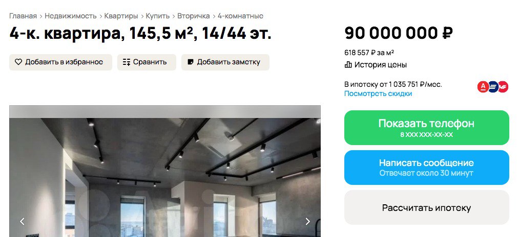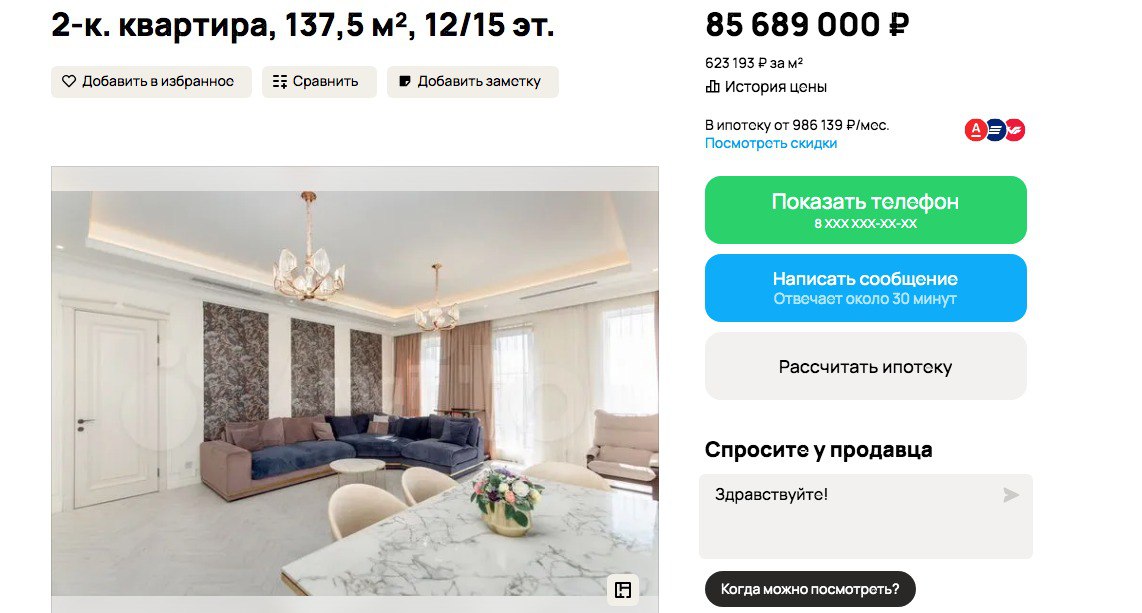 Как ни странно, рейтинг возглавляет «вторичка» за 125 миллионов в уже не самом новом доме «Парус» на 1-ой Морской. Жилплощадь в 340 квадратных метров предлагают за 125 миллионов. Предпоследний этаж и выход на крышу-террасу. Очевидно, речь идет о лифте, который ранее использовался под различные мероприятия и выставки.