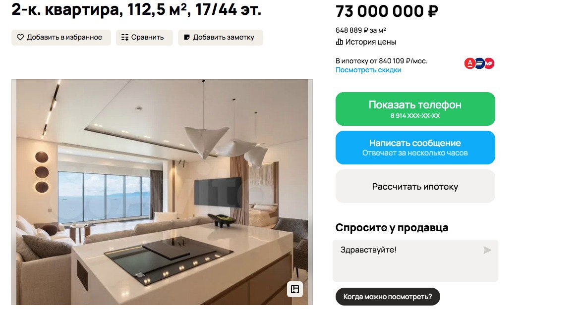 Еще одна полностью готовая к проживанию квартира также продается в «первом небоскребе Дальнего Востока», но цена существенно ниже второй сточки рейтинга. Всего 73 миллиона за 112 квадратных метров со всем необходимым.