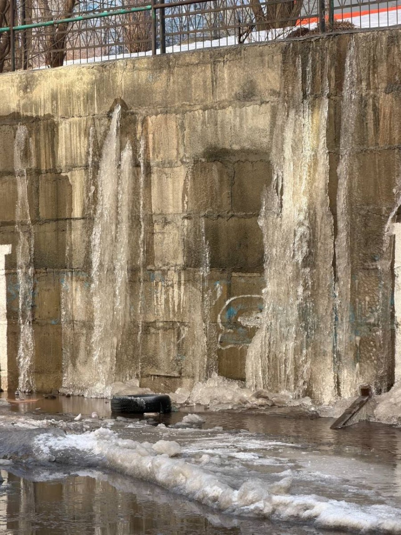 Местные жители, заявляющие о проблеме в социальных сетях и СМИ, утверждают, что интенсивная течь открылась 14 февраля. Вода без характерных запахов и парения стекает по косогору на территории школы по подпорной стене, местные жители опасаются разрушения конструкции. Обледенение мешает как водителям, так и пешеходам – эта дорога стала востребованным пешеходным путём после того, как территорию школы № 73 закрыли для обеспечения антитеррористической безопасности.